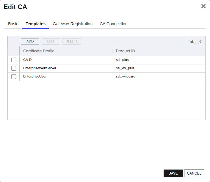 The CA in the AnyCAGateway REST portal will be populated with the mappings of the newly created certificate profiles and the third-party product IDs.