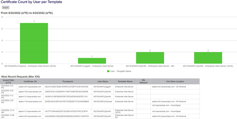 The bar graphs show the number of certificates issued by the certificate requester and template in the selected date range for the selected template(s). The report shows one bar for each requester and template combination; for example, KEYEXAMPLE\jsmith - Template One would be one bar and KEYEXAMPLE\mjones - Template One would be another bar.