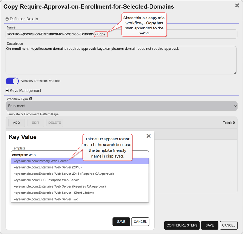 Tip:  There are two built-in workflow definitions—Global Enrollment Workflow and Global Revocation Workflow—that are used to manage enrollment and revocation requests which are not otherwise handled by custom workflows. These workflows can be configured with steps (see Workflow Step Configuration), but they cannot be deleted. There are no built-in workflow definitions for other types of workflows. These actions only go through workflow if you create custom workflows for them.