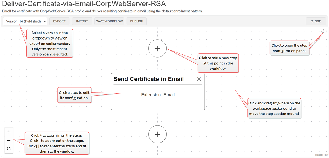 The workflowClosed A workflow is a series of steps necessary to complete a process. In Keyfactor Command, it refers to the workflow builder, which allows you to automate event-driven tasks such as when a certificate is requested, revoked or found in a certificate store. builder in Keyfactor Command provides a flexible framework for managing certificate-related processes from start to completion. It supports automation for activities such as certificate enrollmentClosed Certificate enrollment refers to the process by which a user requests a digital certificate. The user must submit the request to a certificate authority (CA)., renewal, and revocation, as well as responding to changes detected in certificate collections, stores, and alerts.