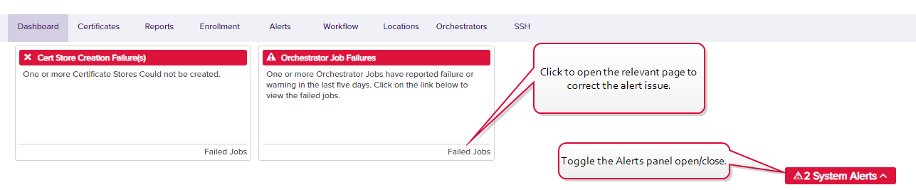 The System Alerts panel appears at the top of the Management Portal page just below the menu bar to display any errors or warnings found within Keyfactor Command. Click on the alerts indicator to toggle the System Alerts panel open/close. Warnings indicate things that may be of concern and appear in yellow. Errors indicate things that may be more urgent and appear in red. Click on the link included at the bottom of the system alert to be taken to the relevant page in the Management Portal to make the required configuration changes or corrections, if applicable. Some examples of conditions for which the system alerts appear include:
