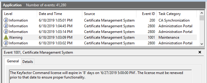 As your license is approaching expiration, you will see an alert appear on the alerts tab of the Management Portal (see System Alerts) and warnings will also be written to the Windows event log on the server running the Keyfactor Command service 60 days, 30 days and 5 days in advance of the license expiration (or at the next start of the Keyfactor Command service that falls within these time periods) using event ID 1001.