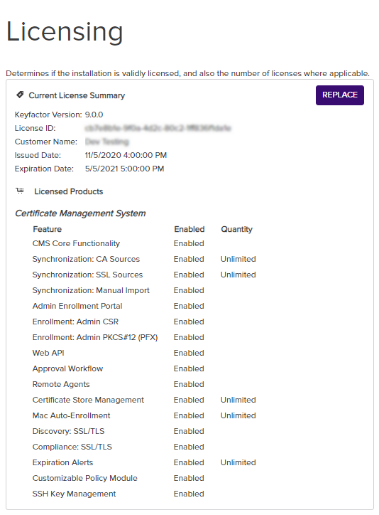 > Licensing. The license shows you the features that are enabled for your Keyfactor Command implementation, how many CA