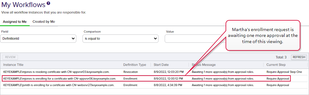 - The user who initiated the workflow (e.g. by beginning a certificate enrollment or revoking a certificate) will see that instance appear on the Created by Me tab of the My Workflows page. When the workflow instance is complete, it will still appear on the Created by Me tab and be searchable.
