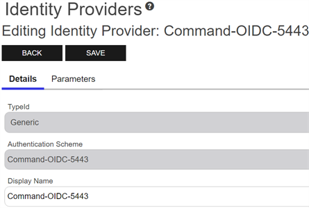 On the Details tab, select a Type in the dropdown. Most identity providers can be supported with the Generic type. For Auth0, select the Auth0 type. Enter a short name for the provider in the Authentication Scheme and a longer name in the Display Name. The TypeId and Authentication Scheme cannot be modified on an edit.