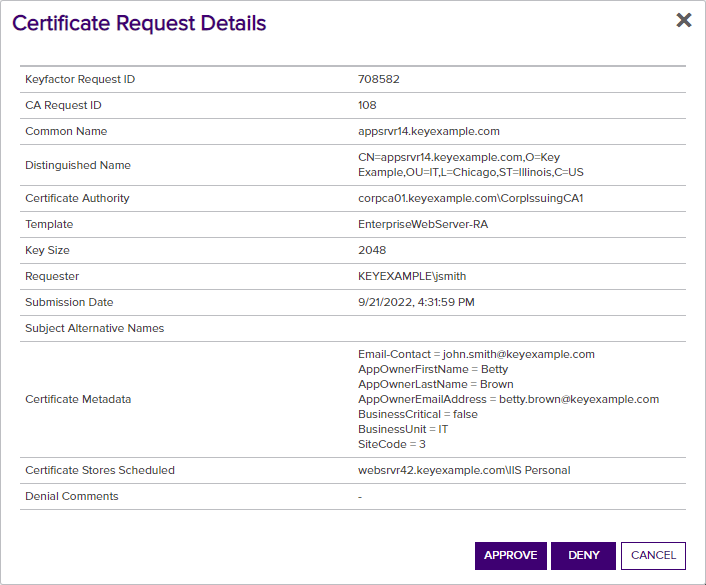 A certificate authority (CA) is an entity that issues digital certificates. Within Keyfactor Command, a CA may be a Microsoft CA or a Keyfactor gateway to a cloud-based or remote CA. level before issuance. The request may be approved or denied from this tab of the certificate requests page or though action on a Pending Request Alert (see Pending Certificate Request Alerts). When the pending requests tab is selected, you will see Approve and Deny buttons activated at the top of the grid. By clicking Details, you can view the certificate details and Approve or Deny the request from the Certificate Request Details dialog. See Approving or Denying a Pending Certificate Request for more information. -