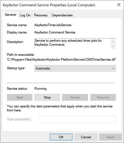 sc config KeyfactorTimerJobService binPath= "dotnet \"C:\Program Files\Keyfactor\Keyfactor Platform\Service\CMSTimerService.dll\""Note: If your Keyfactor Command is installed in a different location than the default, change this path to reflect your installation location. -