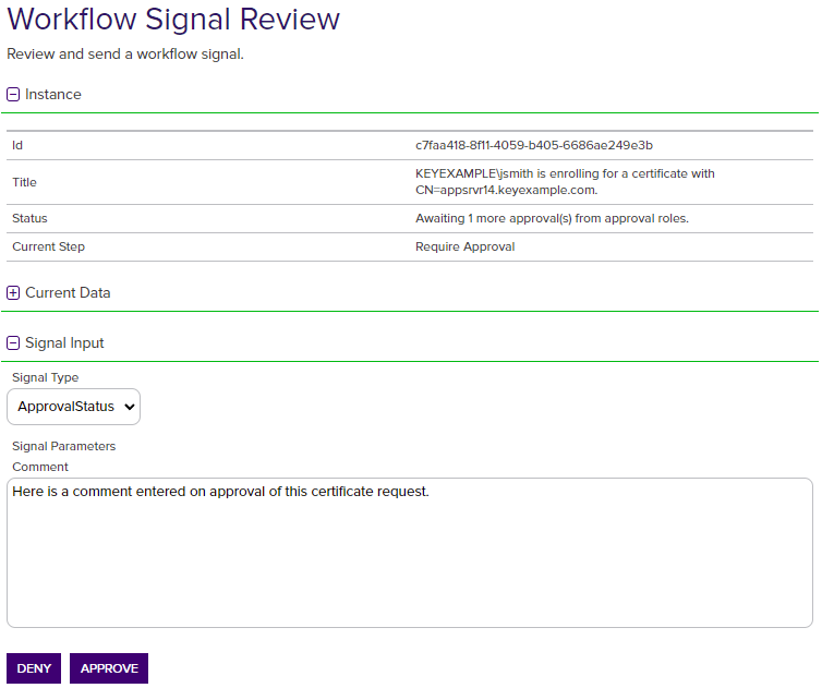 In the Signal Input section of the page, you can submit one or more signals for the step. For the built-in require approval workflow step type, this is where you send an approval or denial for the request along with a comment about the approval or denial.