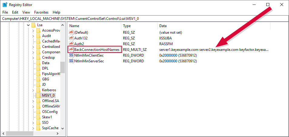 Right-click the MSV1_0 registry key and choose New > Multi-String Value. Name the new value BackConnectionHostNames. Edit the BackConnectionHostNames value and enter each fully qualified domain name—actual name or DNS alias—for a server that needs this feature on a separate line. For example, for full DNS alias support with CA delegation functions, you need to enter the DNS alias of the Keyfactor Command server. For event logging to a machine other than the Keyfactor Command server, you need to enter the name of that server.