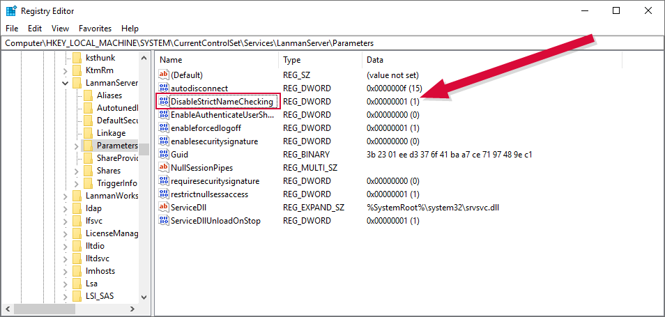 Right-click the Parameters registry key and choose New > DWORD (32-bit) Value. Name the new DWORD value DisableStrictNameChecking. Set the DisableStrictNameChecking value to 1.