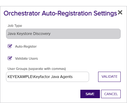 Check the Validate Users box if you want the users under which the orchestrators are running to be a member of a specific Active Directory group in order to auto-register. If you do not enable this but you do enable auto-registration, all orchestrators will auto-register.