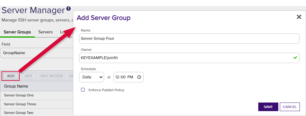 - If desired, check the Enforce Publish Policy box to set the server group to inventory and publish policy mode (see SSH).