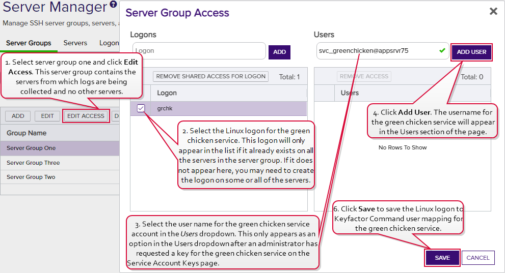 Uses the Management Portal to map the new public key for the full service account user name (svc_greenchicken@appsrvr75) to the Linux logons for the service on the servers from which the logs will be collected (see Editing Access to an SSH Server Group).