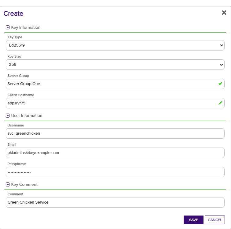 - Uses the Keyfactor Command Management Portal to create a new key pair (see Creating a Service Account Key). She enters the following information in the form: