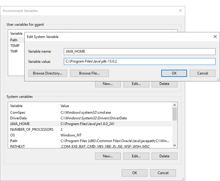 - If it doesn't exist already among the System variables, create the JAVA_HOME environment variable—click New below the System variables box and, in the New System Variable dialog, type JAVA_HOME in the Variable name field and paste the path to the Java base directory in the Variable value field. If the field exists already but with a value that is not correct for the version of Java you wish to use, click Edit and update the Variable value field with the appropriate Java base directory.