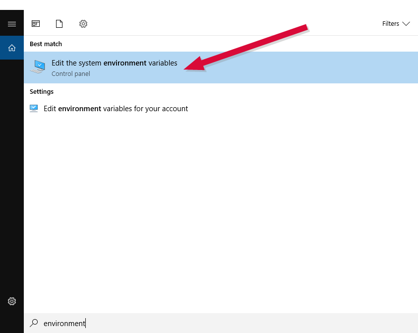- As a user with local administrator permissions, use the search function to search for environment and select the option to edit the system environment variables from the search results.