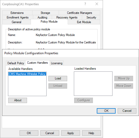 On the Custom Handlers tab of the Policy Module Configuration Properties page, highlight the CMS Machine Whitelist Policy on the list of available handlers, click Load to move it over to the loaded handlers, and click OK.