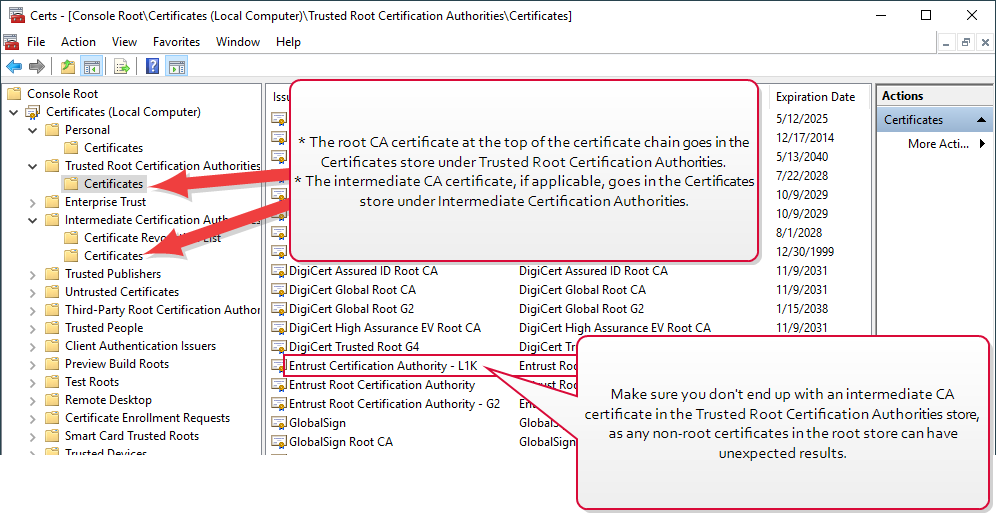 You can install the certificates either through the Certificates MMC or from the command line. To install the CA certificates in the Certificates MMC: