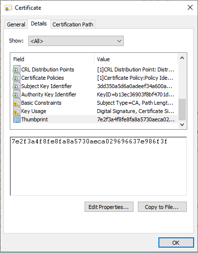 - On the Details tab, scroll down to local the Thumbprint for the certificate. Copy this to a file to save it, being sure to avoid copying any leading or trailing spaces or unprintable characters.