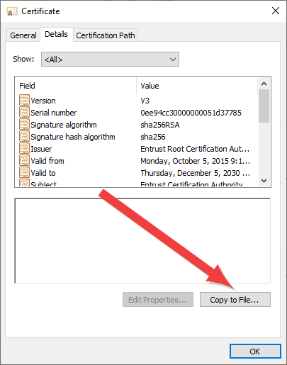 - If the chain certificate is one you want to use, you can download it directly from the certificate chain view on the Details tab. Click Copy to File... .