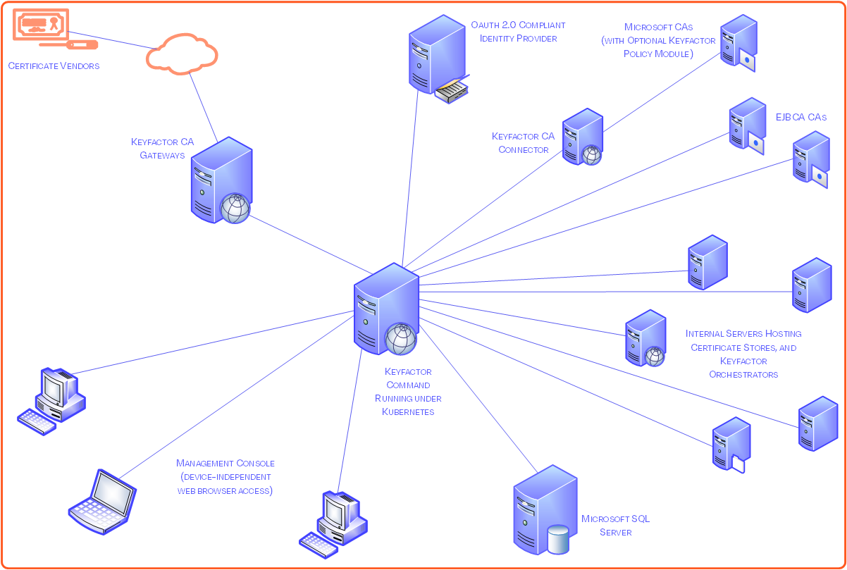 Microsoft and/or EJBCA CAs—Keyfactor Command supports both Microsoft and EJBCA CAs. When Keyfactor Command is installed under Kubernetes, an instance of the Keyfactor CA Connector Client is required to communicate with Microsoft CAs.
