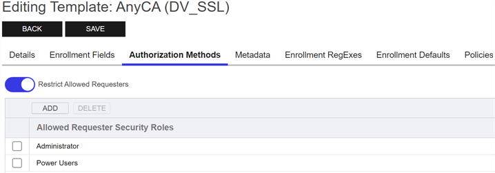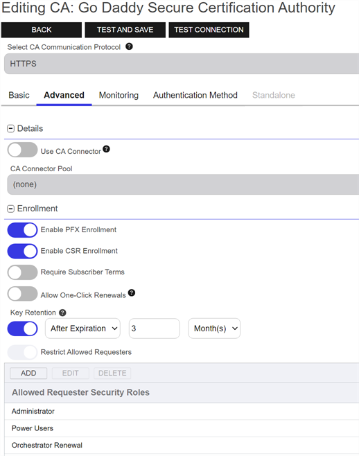 Certificate enrollment refers to the process by which a user requests a digital certificate. The user must submit the request to a certificate authority (CA). is enabled to allow Keyfactor Command to use the gateway for enrollment. - The Restrict Allowed Requesters toggle will be enabled and uneditable. Add at least one role to the Allowed Requester Security Roles grid to enable access to the CA, by selecting Add, choosing a role from the drop down, and clicking Save.