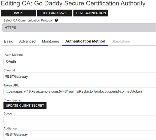 Select the authentication method you configured for the AnyCAGateway REST in the Auth Method dropdown. The authentication method you select here must match the authentication method that the gateway has been configured with—you cannot configure the gateway with OAuth and then use a client authentication certificate to access it from Keyfactor Command, for example.