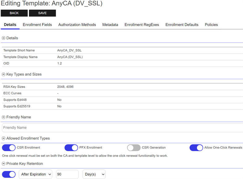 Once the templates have been imported, configure each one to work with Keyfactor Command as required. Besides any implementation-specific settings you may want to adjust, include: