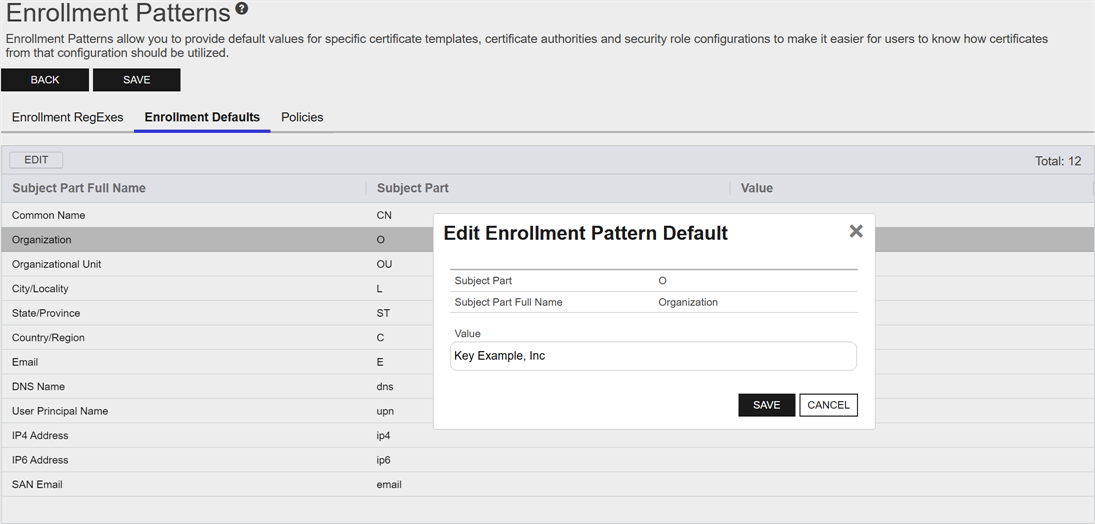 EnrollmentClosed Certificate enrollment refers to the process by which a user requests a digital certificate. The user must submit the request to a certificate authority (CA). patterns in Keyfactor Command provide a flexible way to streamline certificate enrollment by defining default values, policies, and access configurations for specific certificate templates and certificate authorities. This functionality helps reduce duplication of templates at the CAClosed A certificate authority (CA) is an entity that issues digital certificates. Within Keyfactor Command, a CA may be a Microsoft CA or a Keyfactor gateway to a cloud-based or remote CA. level while meeting diverse business requirements. On this page, you can manage enrollment patterns by adding, editing, and deleting them, configuring system-wide settings, and copying existing patterns to create new ones. These operations ensure enrollment processes are tailored to user groups, enforce security policies, and simplify certificate management.