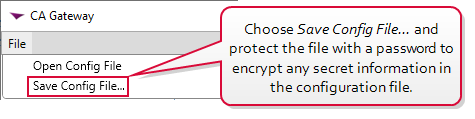 • The gateway can use a file to pass the configuration information into the configuration wizard. You may have been provided one of these already configured for your initial implementation, or you may have created one after typing in all the configuration information during the initial implementation. Create one with your latest configuration by going into the configuration wizard in your current gateway version and choosing File->Save Config File.... This file can be useful to refer to during the upgrade process (using a text editor), is a helpful backup should you need to fallback to your previous version, and can be imported into a new install of the latest gateway as long as you carefully review the configuration after import and confirm that everything is configured correctly and any new configuration added since the configuration file was generated is addressed.