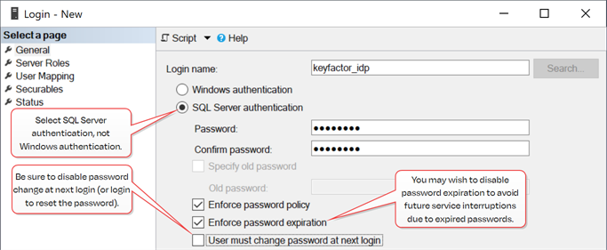 Important:  Keyfactor highly recommends that you use strong passwords for any accounts or certificates related to Keyfactor Command and associated products, especially when these have elevated or administrative access. A strong password has at least 12 characters (more is better) and multiple character classes (lowercase letters, uppercase letters, numeral, and symbols). Ideally, each password would be randomly generated. Avoid password re-use.
