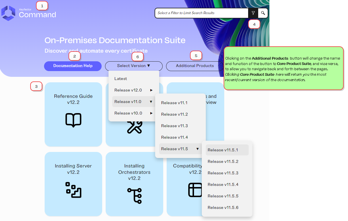 - Search all of Keyfactor Command Documentation Suite from the home page and optionally filter searches.