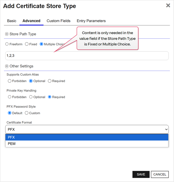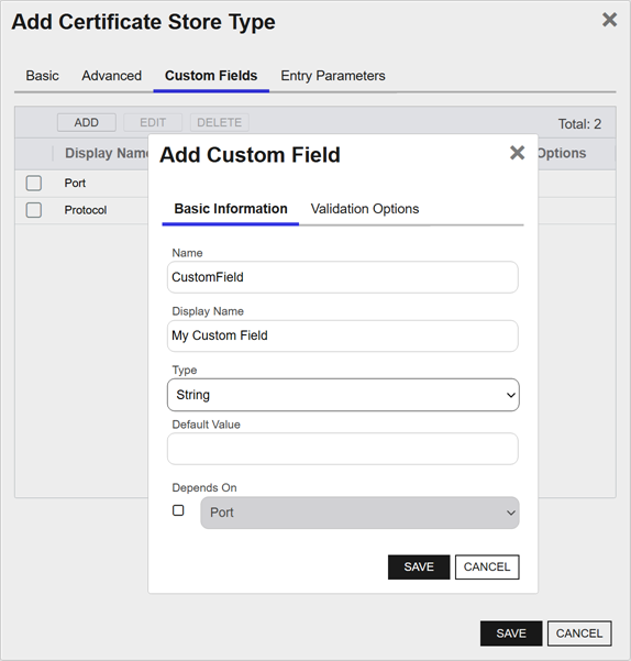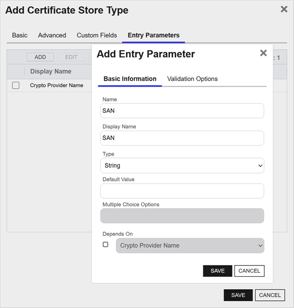 Certificate store types define locations against which Keyfactor Command can perform predefined operations. New ones are commonly added for custom extensions for the Keyfactor Universal OrchestratorClosed The Keyfactor Universal Orchestrator, one of Keyfactor's suite of orchestrators, is used to interact with servers and devices for certificate management, run SSL discovery and management tasks, and manage synchronization of certificate authorities in remote forests. With the addition of custom extensions, it can provide certificate management capabilities on a variety of platforms and devices (e.g. Amazon Web Services (AWS) resources, Citrix\NetScaler devices, F5 devices, IIS stores, JKS keystores, PEM stores, and PKCS#12 stores) and execute tasks outside the standard list of certificate management functions. It runs on either Windows or Linux servers or Linux containers. or for orchestrators created with the Keyfactor AnyAgentClosed The AnyAgent, one of Keyfactor's suite of orchestrators, is used to allow management of certificates regardless of source or location by allowing customers to implement custom agent functionality via an API., the Keyfactor Native Agent, or another of the tools in the Keyfactor Integration SDK (see Orchestrators).