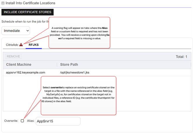 If an inventory job does not already exist for the certificate store, one will be added automatically to update Keyfactor Command with the changes to the certificate store. The inventory job will be configured to run either immediately or at the same exactly once time as the management job, depending on the configuration of the management job and then will be cleared.