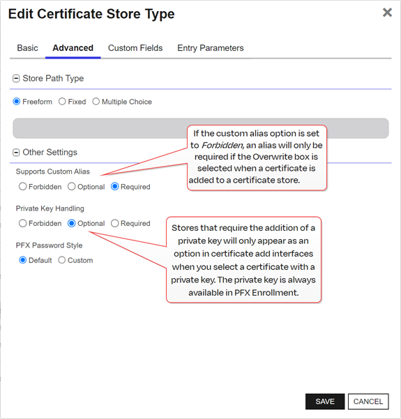 4. For a certificate with an encrypted private key, when prompted enter the password for the encrypted key and Save. This will open the Add Certificate page, which will allow you to change/add metadata and choose certificate locations to deploy the certificate to. Set Private Key Password allows you to reenter the password once you have uploaded the certificate.