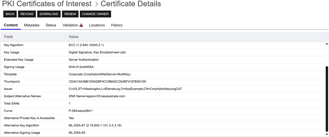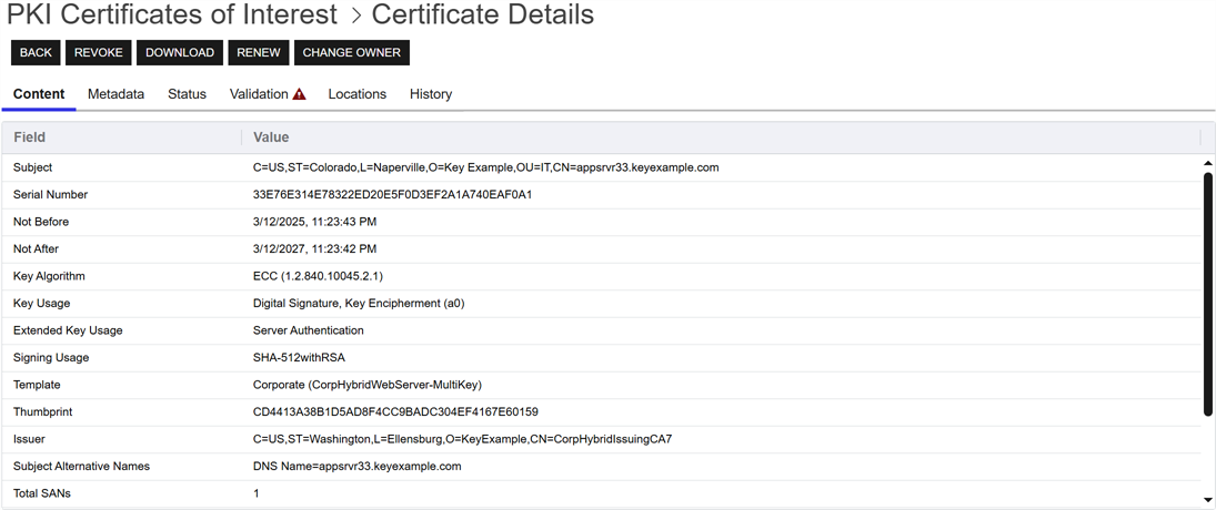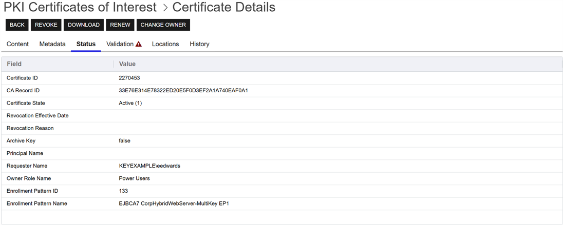 The following action buttons are conveniently located at the top of the Certificate Details page for users with the appropriate permissions: Revoke (see Revoke), Download (see Download), Renew (for certificates accessed from Certificate Search only—see Renew/Reissue), and Change Owner (see Change Owner).