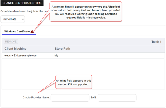 Note:  If you are enrolling against an EJBCA CA, by default the total SAN length cannot exceed 2000 characters. If you need to enter SANs that will cause the total length to exceed this maximum, see Appendix - Configuring Support for Large or Custom SANs with EJBCA.
