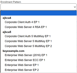 The enrollment patterns are organized by configuration tenantClosed A grouping of CAs. The Microsoft concept of forests is not used in EJBCA so to accommodate the new EJBCA functionality, and to avoid confusion, the term forest needed to be renamed. The new name is configuration tenant. For EJBCA, there would be one configuration tenant per EJBCA server install. For Microsoft, there would be one per forest. Note that configuration tenants cannot be mixed, so Microsoft and EJBCA cannot exist on the same configuration tenant. (formerly known as forestClosed An Active Directory forest (AD forest) is the top most logical container in an Active Directory configuration that contains domains, and objects such as users and computers.). If you have multiple configuration tenants and enrollment patterns with similar names, be sure to select the enrollment pattern in the correct configuration tenant.