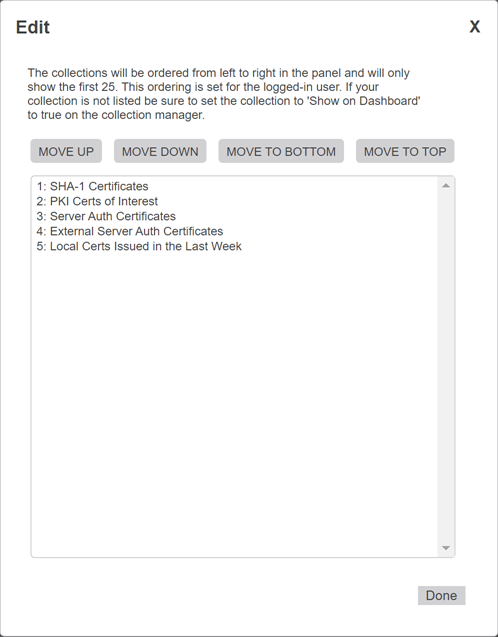 Figure 24: Edit the Dashboard Certificate Collections Order