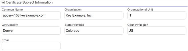 7. In the Certificate Subject Information section of the page, populate the fields as appropriate for the certificate being requested. Although Keyfactor Command does not strictly require the Common Name, the product does ship with a default regular expressionClosed A regular expression--RegEx--is a pattern used to validate data by ensuring it meets specific criteria. Several fields on the CSR enrollment, CSR generation, and PFX enrollment pages support RegEx validation, including certificate subject and metadata fields. requiring a value for this field since it is common for a CA to require this. This regular expression may have been altered in your environment (see Enrollment Pattern Operations).