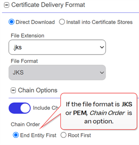 14. In the Certificate Delivery Format section of the page, select either Direct Download—to download the certificate immediately—or Install into Certificate Stores—to schedule the certificate to be added to one or more configured certificate stores. If you do not have any configured certificate stores, the Install into Certificate Stores option will not appear.