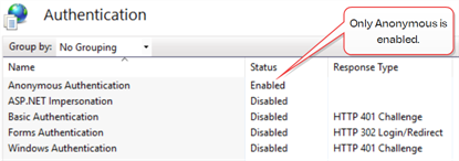 If authentication is not working as expected, it can be helpful to review whether the authentication configuration in IIS is correct for the identity provider you have configured. The correct IIS authentication configurations are: