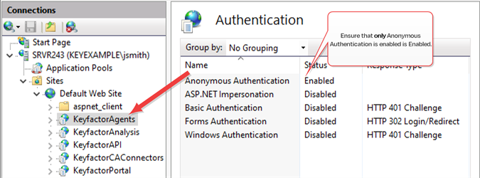 In the IIS Management console, drill down into sites and into the Default Web Site (or other web site if your Keyfactor Command instance has been installed in an alternate web site). Under the Default Web Site, locate the KeyfactorAgents application and open Authentication for this. Disable all the authentication methods and enable only Anonymous Authentication.