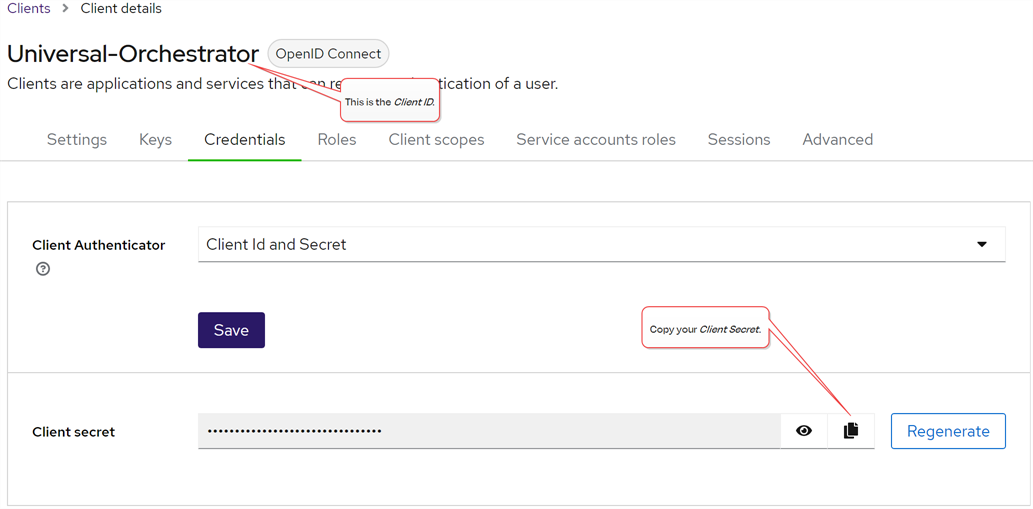 If you’re using an identity provider other than Active Directory, a client (not user) in the identity provider is used. The client should be configured with a secret and have Client authentication and Service account roles enabled (see Service Accounts). The user installing the orchestrator will need the client ID and secret.