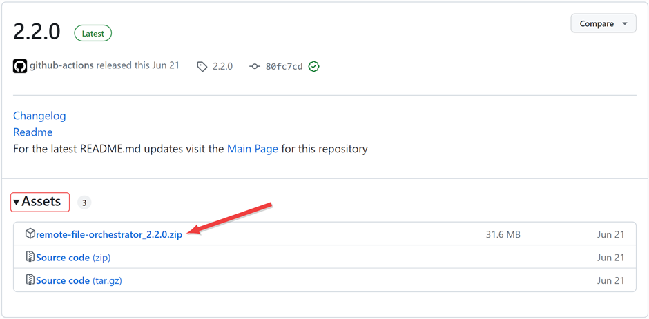 On the GitHub version page in the Assets section, click the package name to download the zip file.