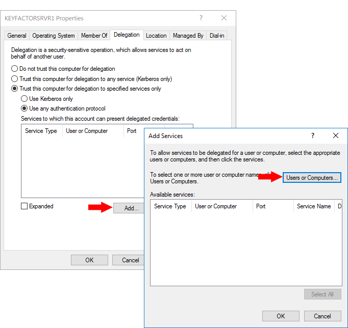 - On the Delegation tab for the machine account, choose “Trust the computer for delegation to specified services only” and under that “Use any authentication protocol” and then click Add.