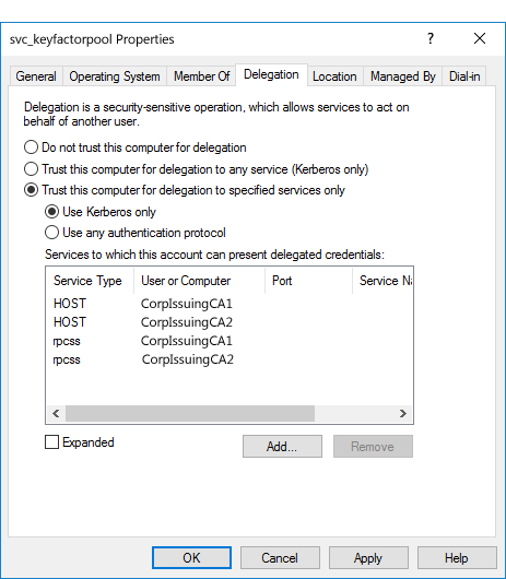- With the traditional version of constrained delegation, you configure the service account under which the Keyfactor Command Management Portal application pool runs and the machine account of the Keyfactor Command server to be allowed to delegate to each of your CAs.