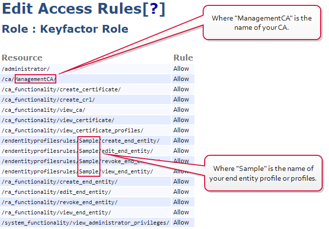 You may either create a new access rule that limits access to just these required permissions, or use an existing access rule. In either case, you need to add the certificate or OAuth client used to authenticate Keyfactor Command to the EJBCA CA as a member of that access rule.