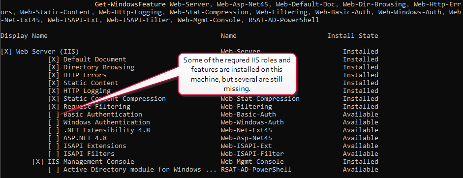 Output from this command will look something like the following, which shows some required features installed and some missing. Make sure all roles and features in the query output are marked Installed before continuing.