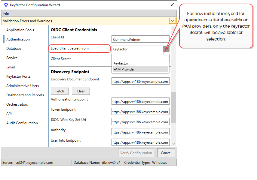 Select the source from which to load client secret credentials you will use for this configuration. Note: For new installations and upgrading databases with no PAM providers, only Keyfactor will be offered. If a PAM provider has been added to the database (such as when upgrading and existing database), the dropdown option of PAM Provider will be offered.